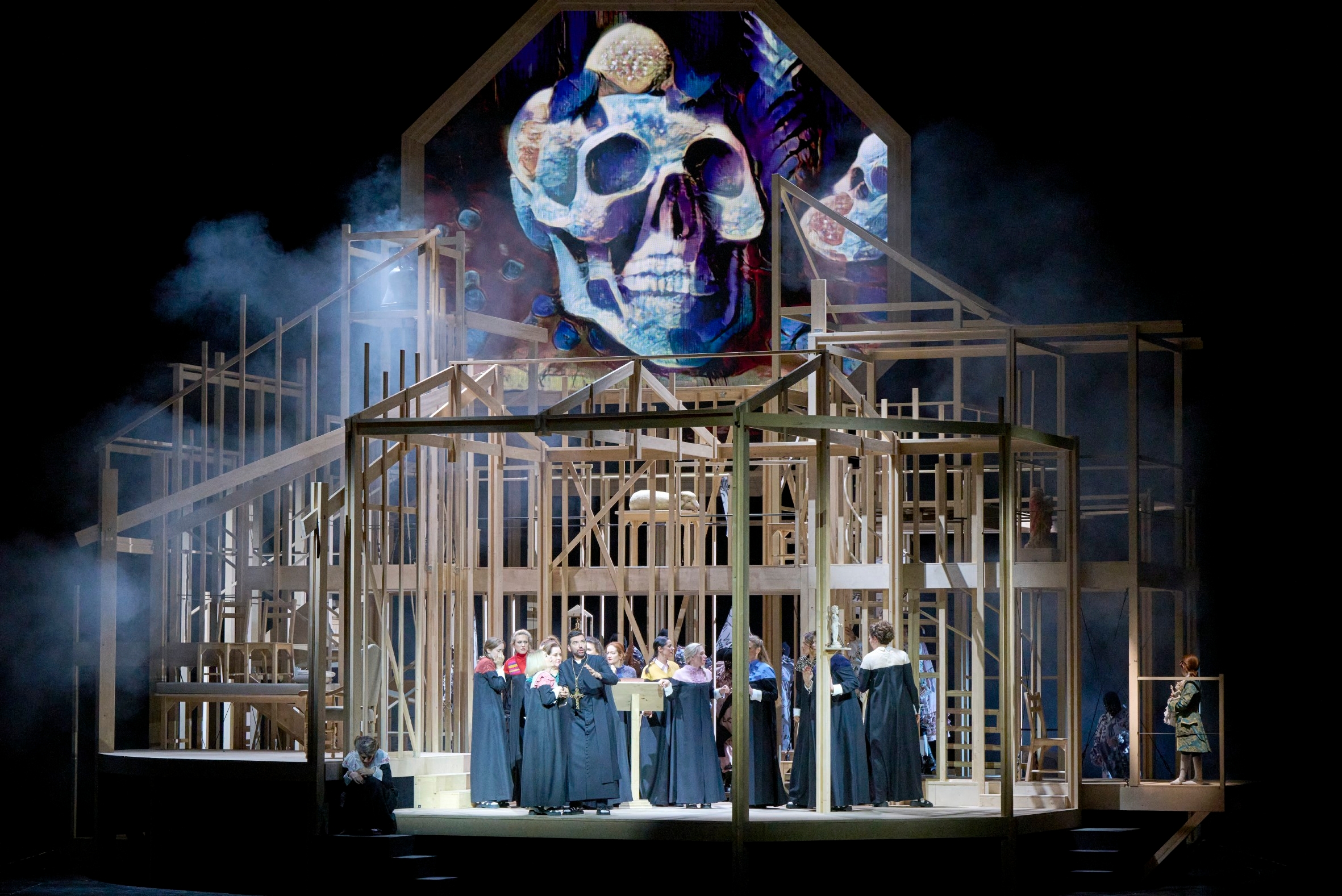 Die Lebendigkeit des Werks verdankt sich auch der ausgeprägten Arbeit mit wiederkehrenden Motiven, die die handelnden Personen charakterisieren, vor allem aber atmosphärische Akzente von unheimlichem Facettenreichtum setzen. Diese Vielfalt nimmt die Inszenierung Magdalena Fuchsbergers auf, die die Karmelitinnen in eindringlichen Bildern durch die »Wohnungen der Inneren Burg« bis auf das Schafott führt. Die österreichische Regisseurin macht derzeit an Deutschen Bühnen mit mutigen, dabei handwerklich perfekt gearbeiteten Inszenierungen auf sich aufmerksam.
